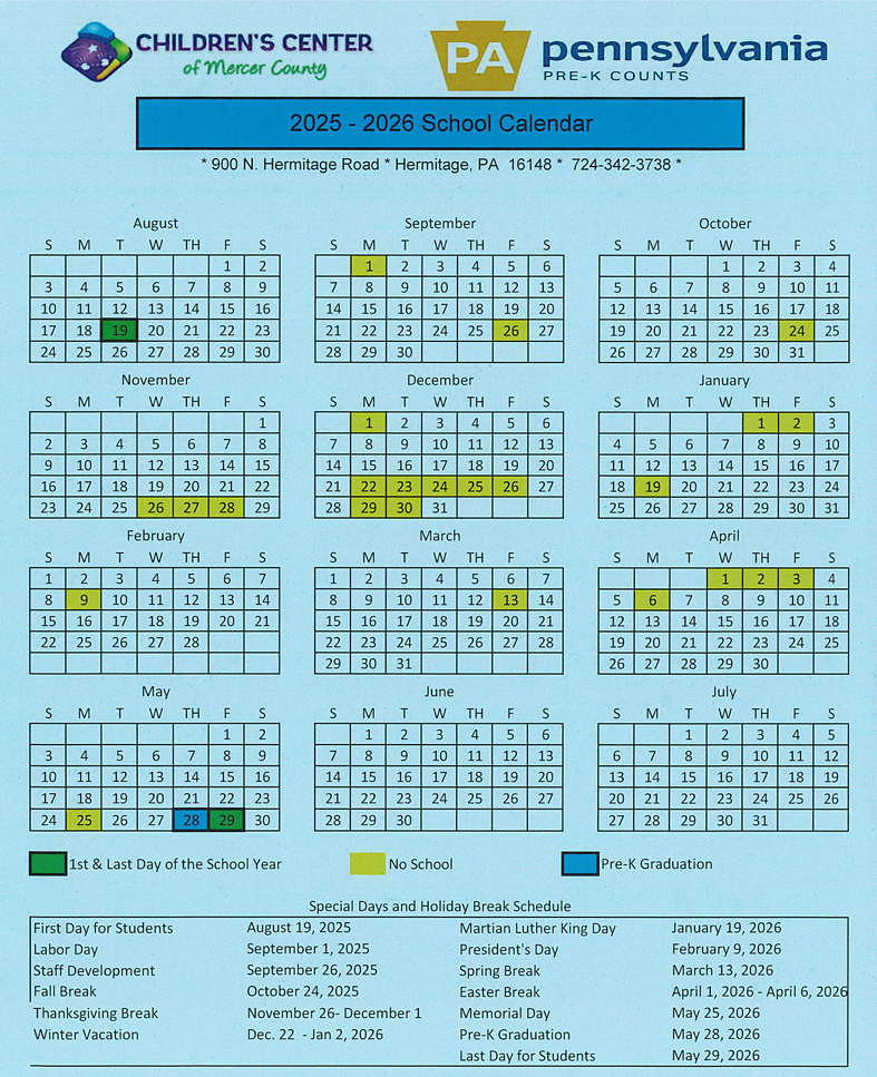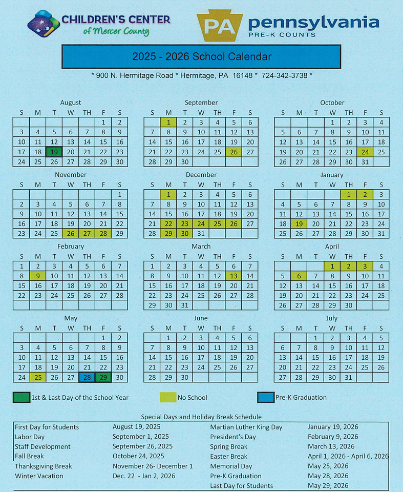 Pre-K and Preschool Classroom will follow the Hermitage School District calendar. When the school district is off the Day Care center will be open for childcare for school age children. - Please be sure to contact the office (724) 342-3738 for more details.