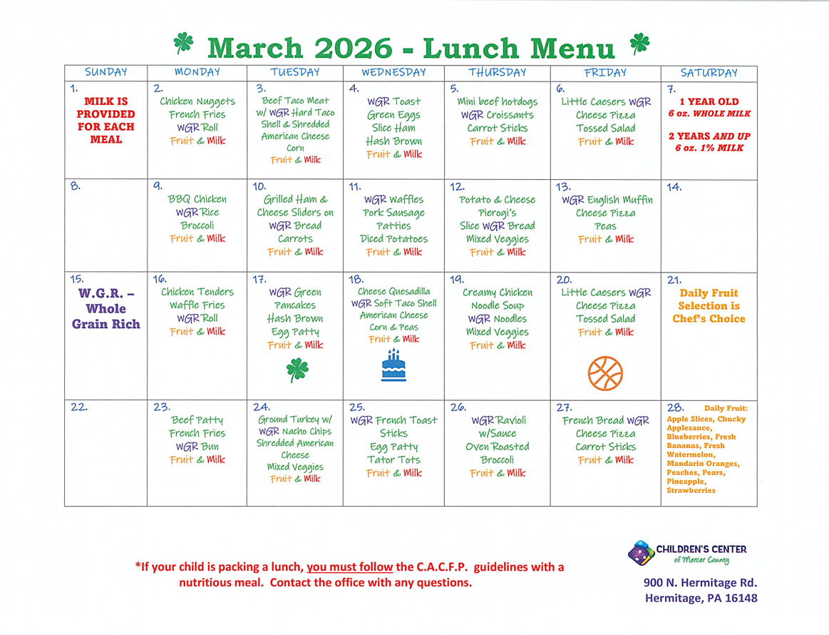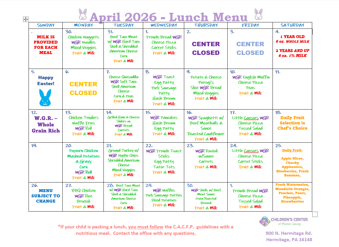 Children’s Center of Mercer County stives to help your child meet their daily nutritional needs. We offer healthy meals, snacks, and 1% milk to all our children as a part of our participation in the CACFP Program. We train our staff on how follow USDA serving, portion size guidelines, cleaning and sanitation standards, and maintain accurate records. We provide families with information and guidelines for participation.